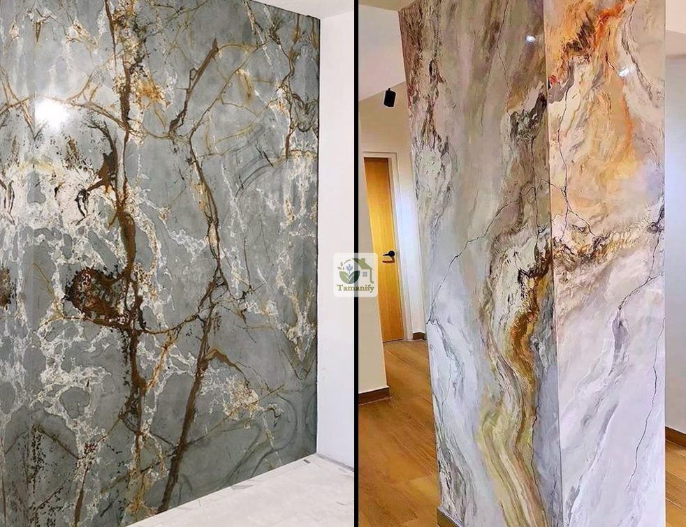 Salah satu keunggulan utama teknik ini adalah kemampuannya meniru tampilan alami berbagai material tanpa harus menggunakan bahan aslinya yang jauh lebih mahal. Misalnya, cat wash marmer Medan sering digunakan untuk menciptakan nuansa marmer Italia di dinding ruang tamu, lobby hotel, atau area resepsi tanpa harus membeli lembaran batu marmer asli yang harganya bisa mencapai jutaan rupiah per meter. Hasil akhirnya nyaris tidak bisa dibedakan secara kasat mata—urat-urat marmer terlihat alami, dengan gradasi warna yang halus, refleksi cahaya lembut, dan kesan mewah yang kuat. Tak hanya itu, teknik cat wash marmer juga memungkinkan variasi warna yang tidak tersedia di marmer alami, sehingga desain bisa disesuaikan dengan tema ruangan.