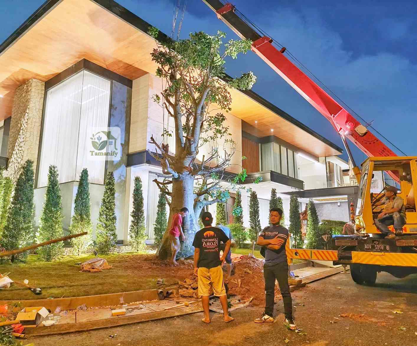 Berbeda dengan tanaman kecil yang bisa dibungkus seadanya, pohon besar seperti baobab memerlukan teknik pengangkutan hortikultura berat (heavy horticulture transport). Di sinilah pentingnya memilih penyedia layanan yang sudah berpengalaman, seperti Tamanify, yang tidak hanya menjual tanaman, tapi juga memberikan solusi lengkap mulai dari penggalian, transportasi, hingga pemasangan di titik akhir.