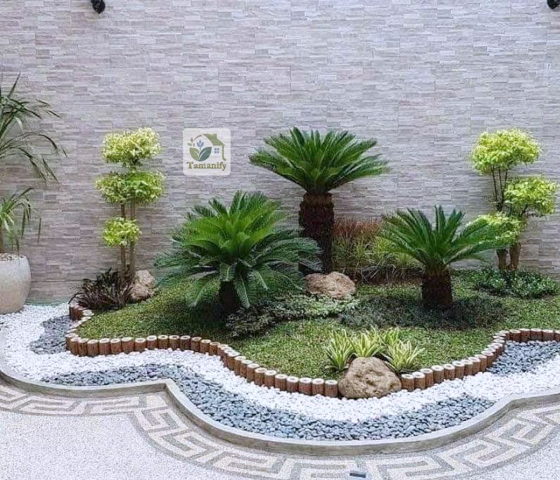 Misalnya, satu pohon besar ditempatkan di tengah taman sebagai fokus utama, dua pohon sedang di sisi kanan-kiri untuk keseimbangan, dan beberapa varian mini di bagian depan sebagai pelengkap. Dengan cara ini, taman terlihat lebih alami dan proporsional tanpa harus menanam terlalu banyak jenis tanaman.