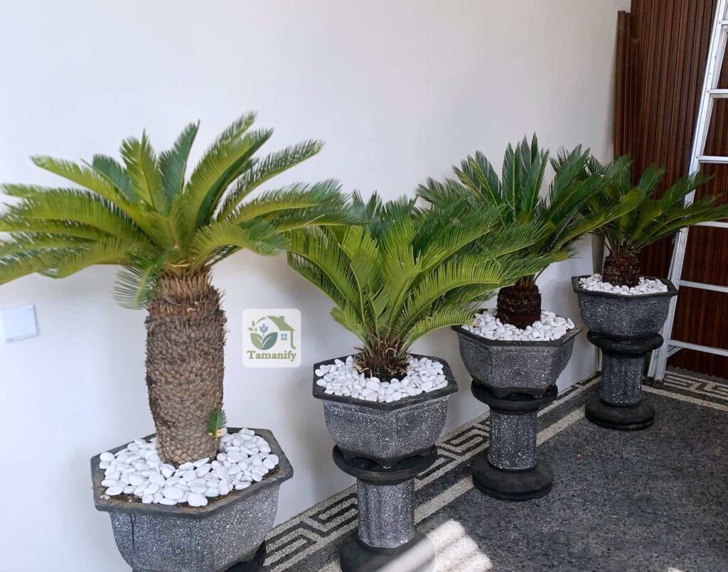 Palem sikas mini biasanya ditanam dalam pot dekoratif berbahan keramik, beton, atau fiber. Karena bentuk daunnya menyerupai mahkota, ia sering dijadikan focal point kecil di meja atau sudut ruangan. Kelebihan utama varian mini ini adalah mudah dipindahkan dan cocok bagi mereka yang ingin mempercantik ruangan tanpa membutuhkan lahan besar.