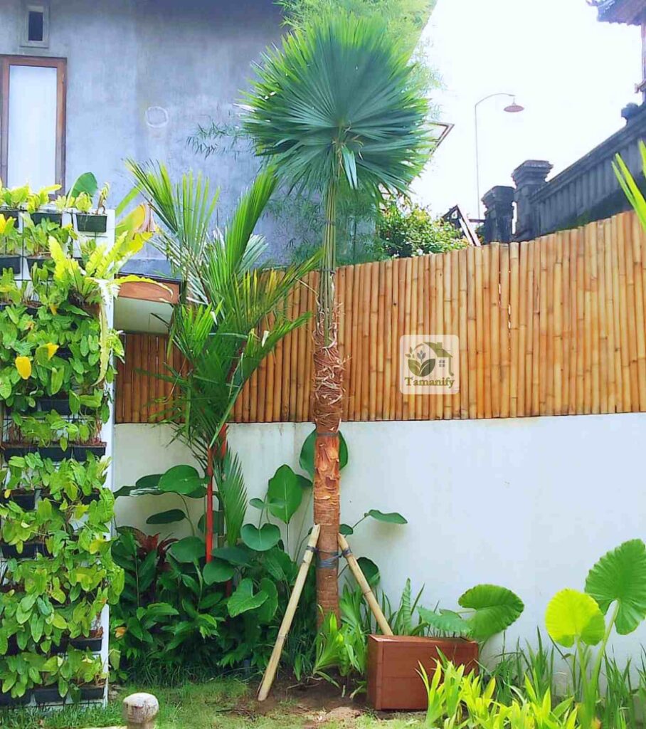Bagi pemilik properti yang menginginkan kesan resort atau vila di tengah kota, Palem Sadeng adalah pilihan sempurna. Daun kipasnya memantulkan cahaya matahari dengan lembut, menciptakan bayangan yang artistik di dinding dan jalan setapak taman. Sementara itu, batangnya yang tinggi dan bersih menjadi elemen vertikal yang menambah keseimbangan visual di antara tanaman rendah atau semak hias di sekitarnya.