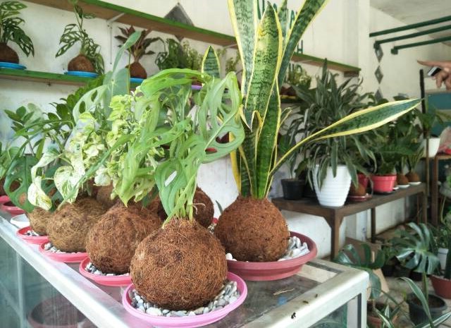 Tanaman yang ditanam dalam bola lumut, sering digantung atau diletakkan di batu.