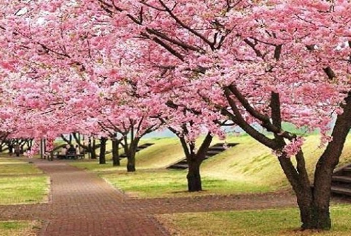 Bunga sakura mekar di musim semi dengan kelopak merah muda atau putih, menciptakan kanopi seperti awan.