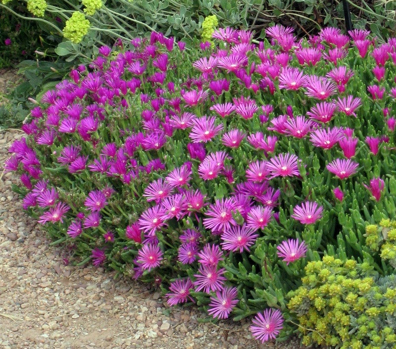 Tanaman es adalah sukulen merambat dengan bunga merah muda, oranye, atau ungu. Mekar melimpah di musim semi.